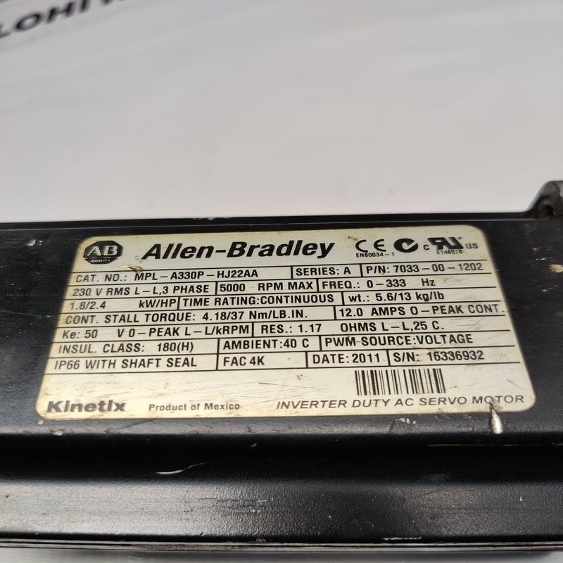 ALLEN BRADLEY MPL-A330P-HJ22AA SERVO MOTOR (USED CONDITION) Supplier In Bhavnagar, Gujarat, India Lohiya Electricals deals in all types of Industrial Automation Products and We are dealing in all of India. Model No:- MPL-A330P-HJ22AA Product Name:- ALLEN BRADLEY MPL-A330P-HJ22AA SERVO MOTOR Brand:- ALLEN BRADLEY Condition:- USED CONDITION ALLEN BRADLEY MPL-A330P-HJ22AA SERVO MOTOR is available in stock. Note:- Custom/Duty and charges will be paid by the buyer (if any) MORE INFORMATION ABOUT THIS PRODUCT:- Description:- MPL-A330P-HJ22AA SERVO MOTOR MP SERIES KINETIX PERMANENT MAGNET LOW INERTIA 240 VAC 100 MM FRAME 3 INCH STACK LENGTH 5000 RPM 2000 LINE ENCODER SHAFT KEY / NO SEAL BAYONET CONNECTOR RIGHT ANGLE 180 ROTATABLE NO BRAKE IEC METRIC PLEASE CHECK LABEL PHOTO FOR MORE INFORMATION Further Information: Lohiya /Electricals Call: +91 - 9427215462 Mail: lohiyaelectricals@gmail.com UPLOADED BY:- M.G.