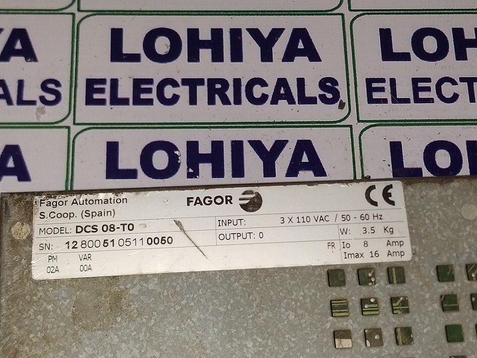 FAGOR DCS 08-T0 SERVO DRIVE Supplier In Bhavnagar, Gujarat, India. Lohiya Electricals Dealing in all types of Industrial Automation Product and We are dealing in all India. Model No: DCS 08-T0 Products Name: FAGOR DCS 08-T0 SERVO DRIVE Brand: FAGOR Condition: Used and Workin FAGOR DCS 08-T0 SERVO DRIVE available in Stock. For Further Information: Lohiya Electricals Call: +91 - 9427215462 Mail: lohiyaelectricals@gmail.com