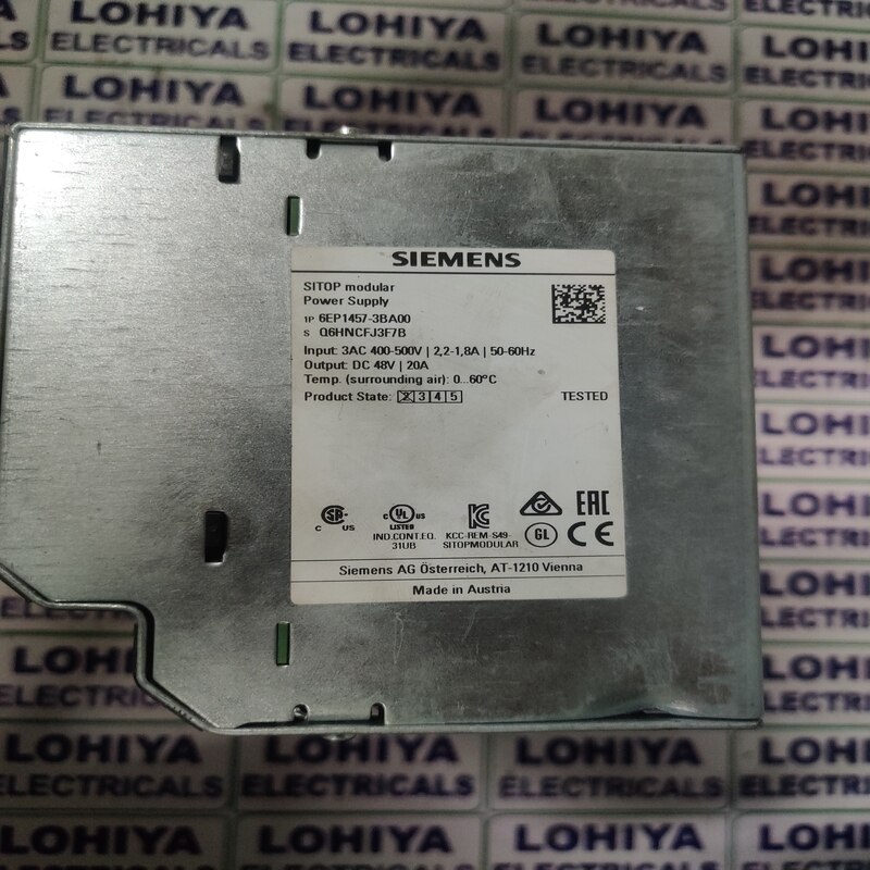 SIEMENS 6EP1457-3BA00 POWER SUPPLY Supplier In Bhavnagar, Gujarat, India. Lohiya Electricals Dealing in all types of Industrial Automation Product and We are dealing in all India. Model No: 6EP1457-3BA00 Products Name: SIEMENS 6EP1457-3BA00 POWER SUPPLY Brand: SIEMENS Condition: Used and Working SIEMENS 6EP1457-3BA00 POWER SUPPLY available in Stock. For Further Information: Lohiya Electricals Call: +91 - 9427215462 Mail: lohiyaelectricals@gmail.com